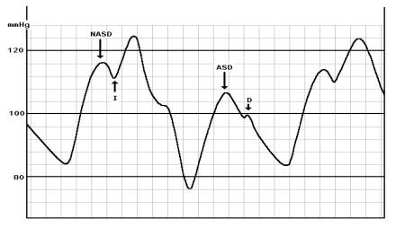 De inflatie wordt ingesteld op de dicrotic notch van de arteriële curve, zie figuur normale arteriële drukcurve.